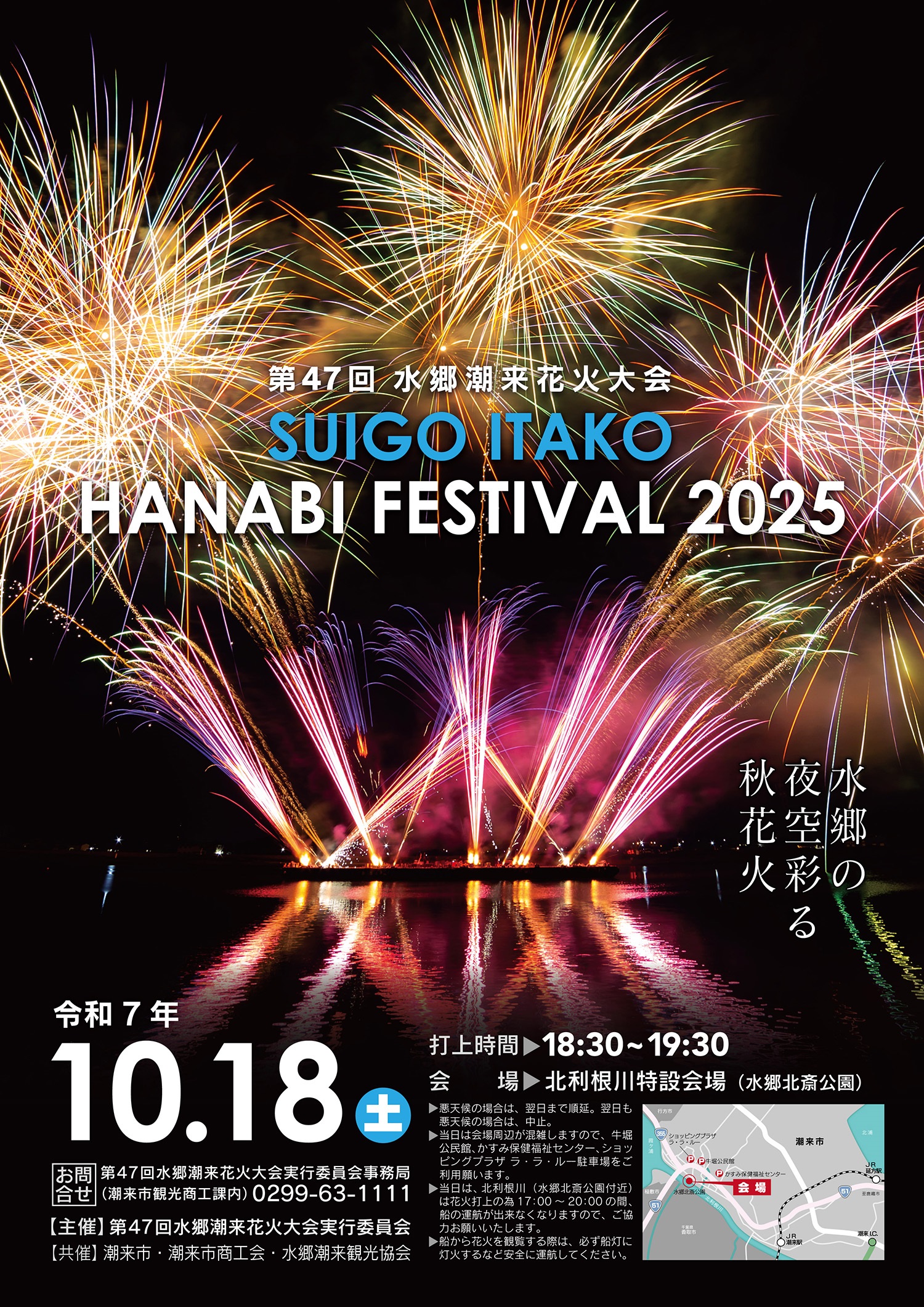 第47回水郷潮来花火大会 開催のお知らせ 第47回水郷潮来花火大会が10月18日(土)に北利根川特設会場(水郷北斎公園)にて開催されます。会場の水郷北斎公園からは、水上から打ち上がる花火を間近にお楽しみいただけます。水郷北斎公園で、見上げる花火をぜひお楽しみください。 インターネット販売 桟敷席URL https://t.pia.jp/pia/event/event.do?eventBundleCd=b2560381